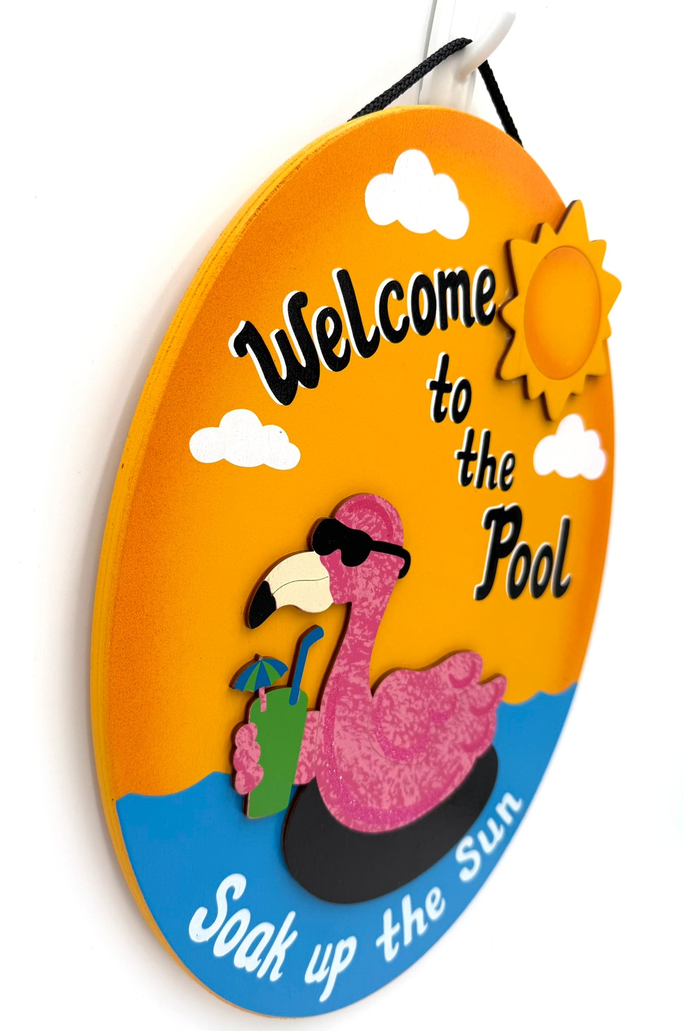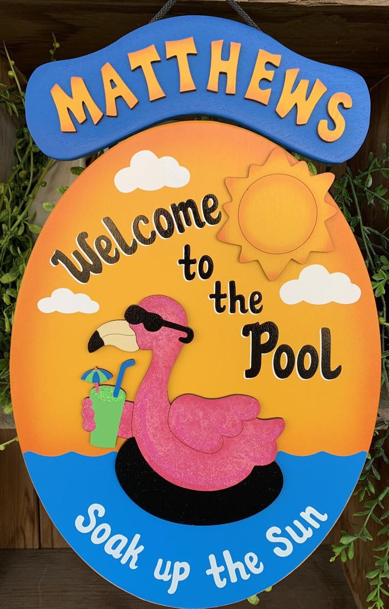 This handmade flamingo sign will get some good laughs. Sign is made from wood and painted with exterior paint.  The flamingos, sunshine and palm tree are separate pieces of 1/8" wood that is painted and securely attached to the flamingo sign. Hand-painted with vibrant, colorful exterior paint, this sign is perfect for your backyard swimming pool oasis.  Finished  with a sturdy nylon rope for easy hanging. Names can be personalized with yellow wooden lettering. Fill in names in notes to buyer section at checkout. Proudly designed and Made in the USA!