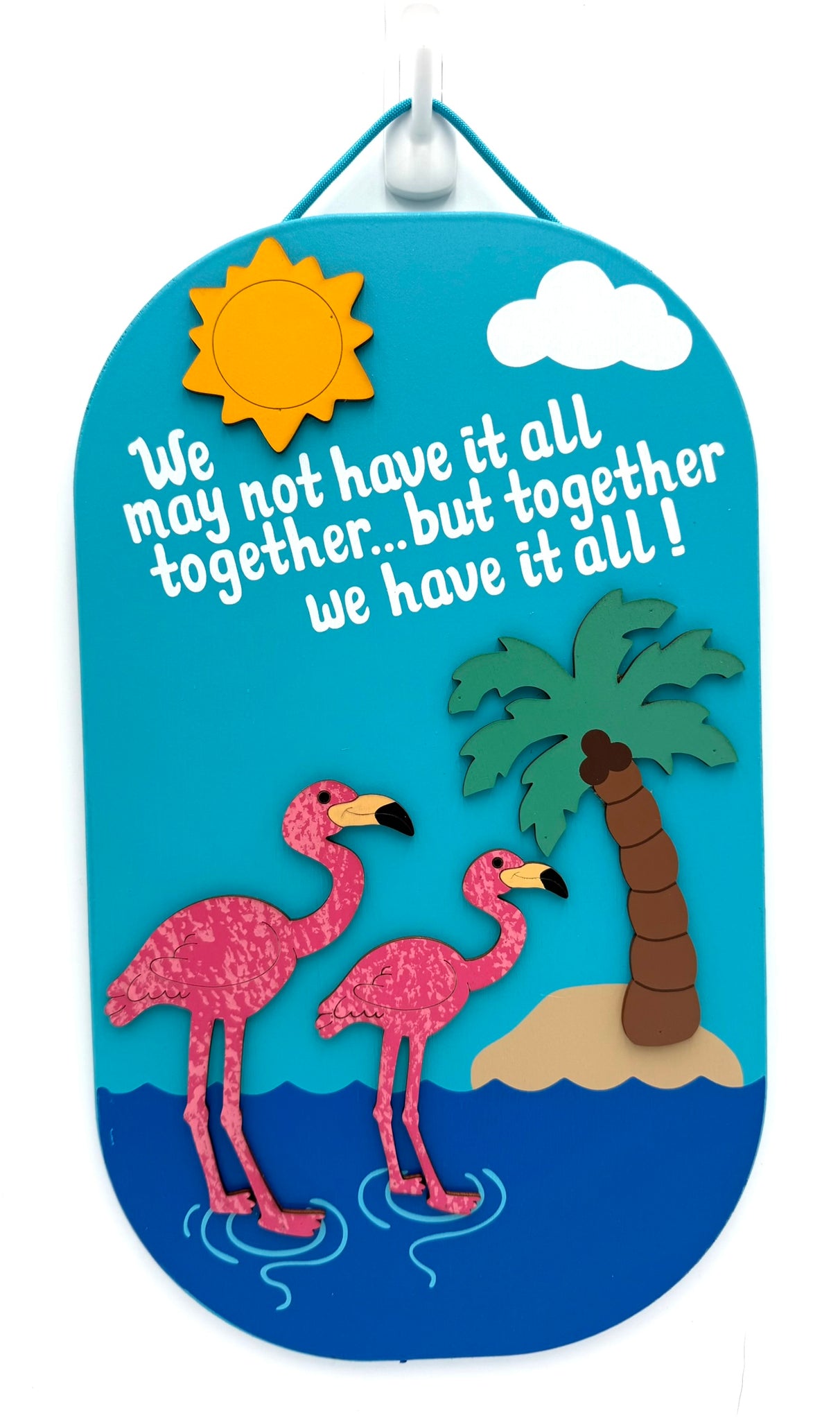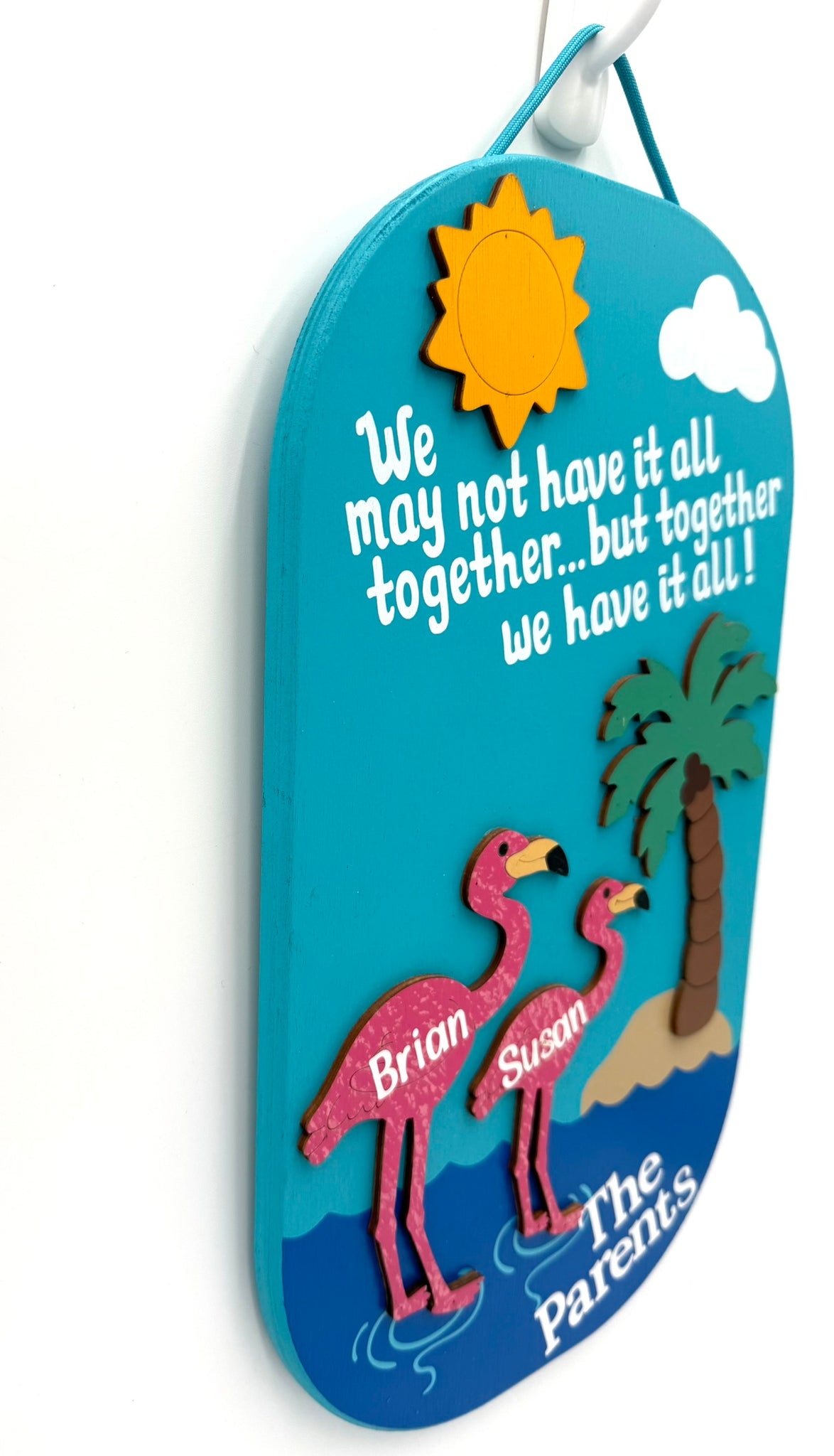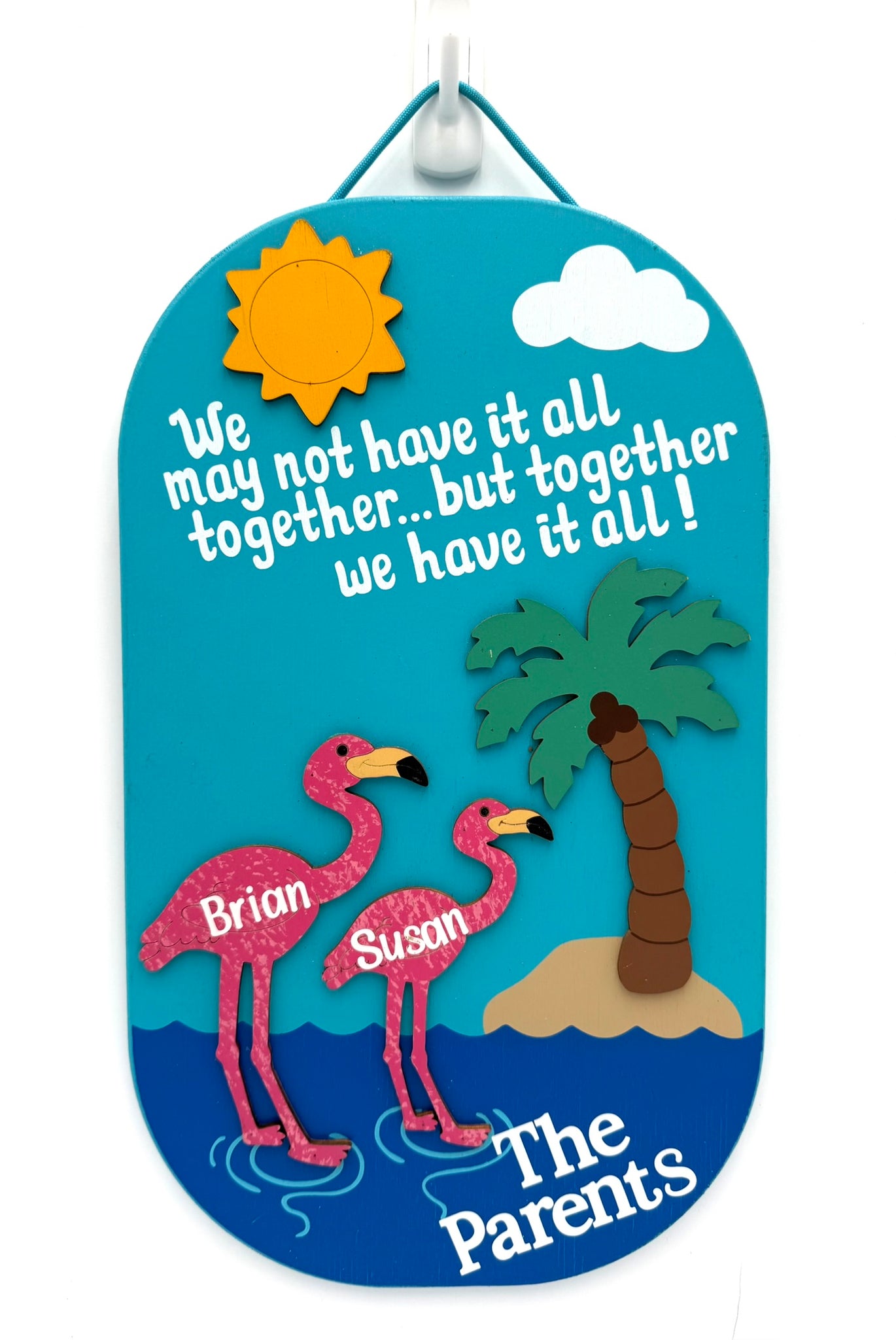 This handmade flamingo sign will get some good laughs. Sign is made from wood and painted with exterior paint. The flamingos, sunshine and palm tree are separate pieces of 1/8" wood that is painted and securely attached to the flamingo sign. Hand-painted with vibrant, colorful exterior paint, this sign is perfect for your backyard swimming pool oasis. Finished with a sturdy nylon rope for easy hanging. Names can be personalized with white vinyl lettering. Fill in names in notes to buyer section at checkout. Proudly designed and Made in the USA!