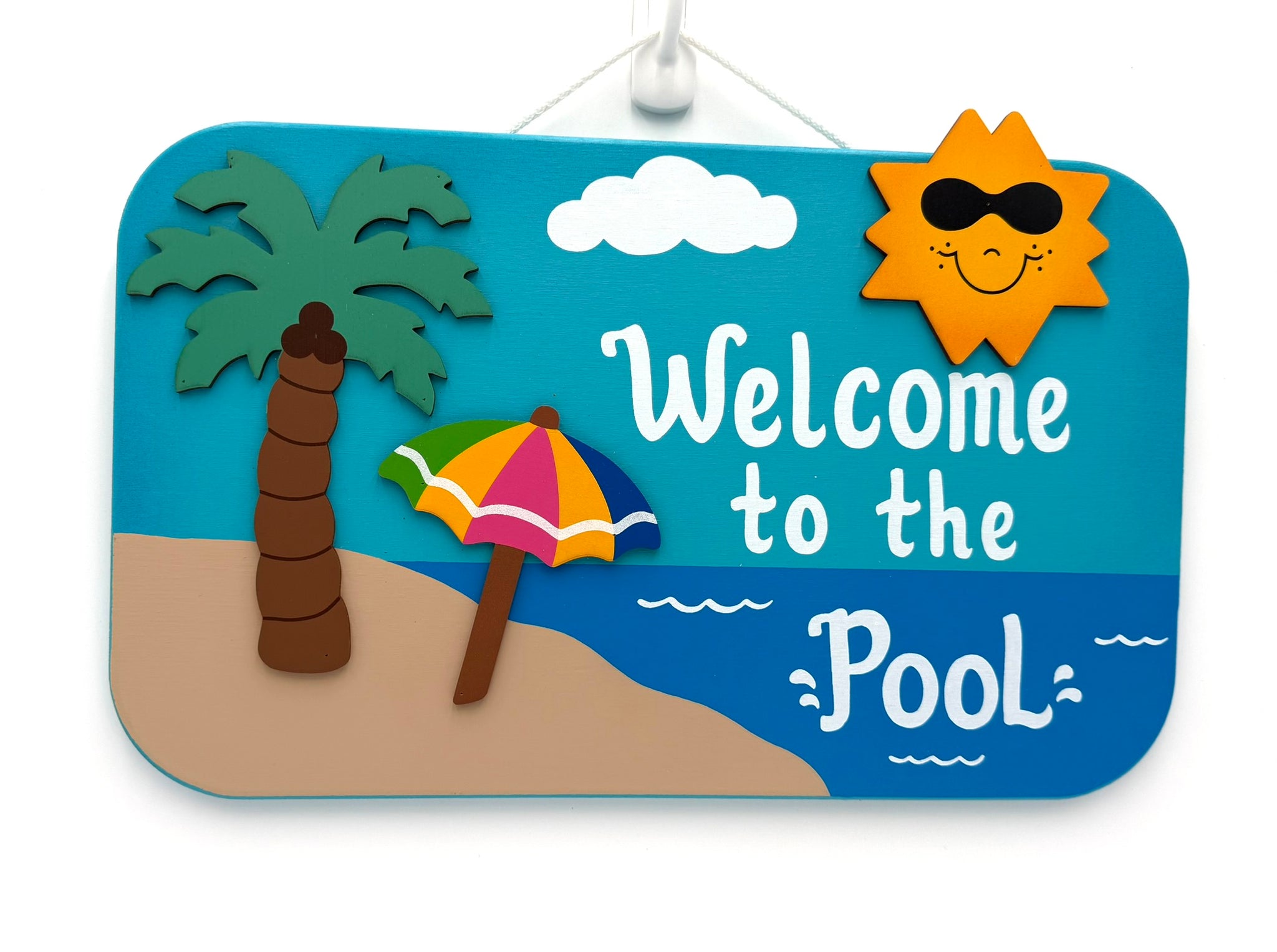 This handmade swimming pool sign will add a tropical touch to your swimming pool area. Let your friends and family know that they are welcome at your pool. Sign is made from wood and painted with exterior paint. The palm tree, umbrella and sunshine are each separate pieces of 1/8" wood that is painted and securely attached to this tropical swimming pool sign. Hand-painted with vibrant, colorful exterior paint, this sign is perfect for your backyard swimming pool oasis. Finished with a sturdy nylon rope for easy hanging. Proudly designed and Made in the USA!