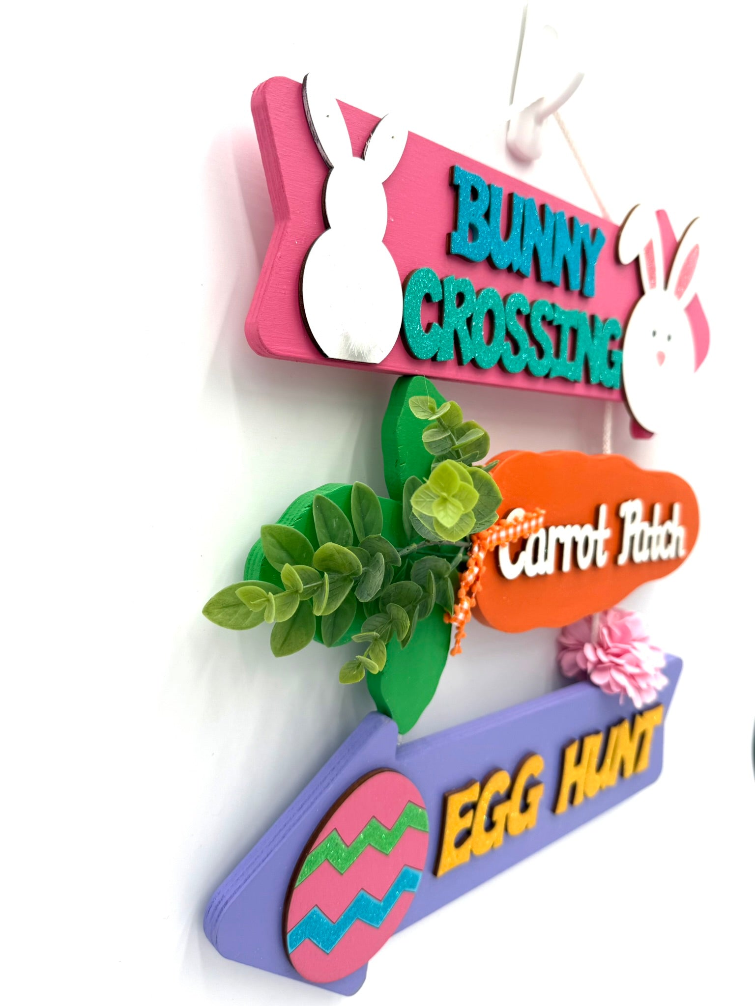 Spring bunny decoration is handmade from wood & painted with a high quality paint. The raised detail adds character to this bunny sign. Letters, bunny body, bunny head and egg are separate pieces of 1/8" wood that are securely attached to this adorable bunny sign. Carefully hand-painted, each bunny sign features a ribbon bow, artificial flowers and a touch of sparkling glitter. Nylon rope is secured to the back side to display. Proudly designed and Made in the USA!
