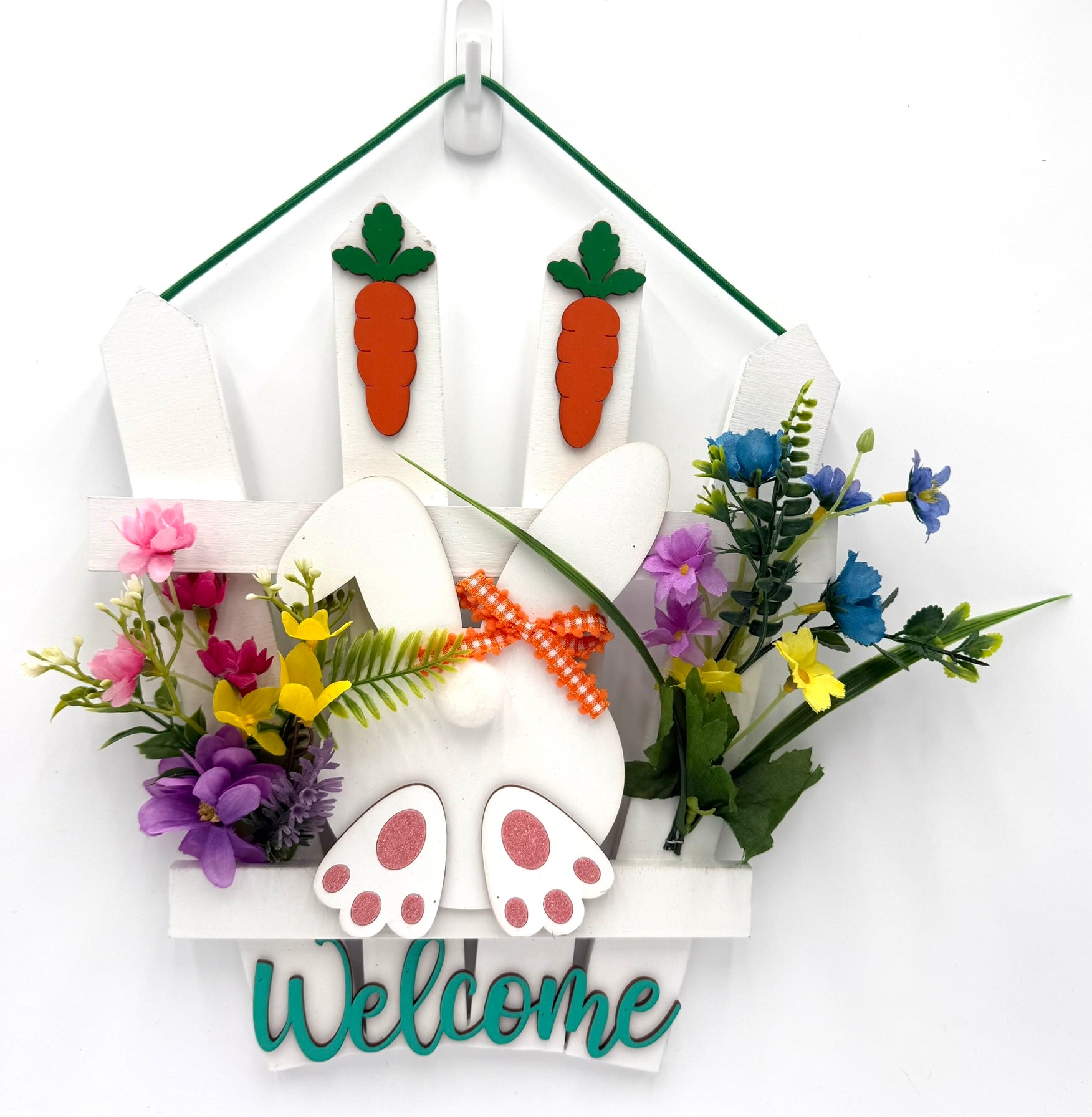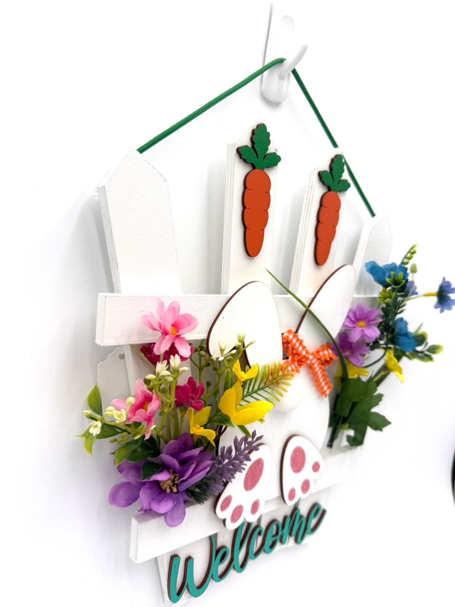 Celebrate Easter and greet guest with a smile. Bunny garden fence decoration is handmade from wood & painted with a high quality paint. The raised detail adds character to this bunny butt digging in the garden . Bunny body, carrots & bunny feet are separate pieces of 1/8" wood that are securely attached to this handmade garden fence. Carefully secured each bunny features artificial flowers and a touch of sparkling glitter. Nylon rope is secured to the back side to display as a hanging bunny sign. Proudly designed and Made in the USA!