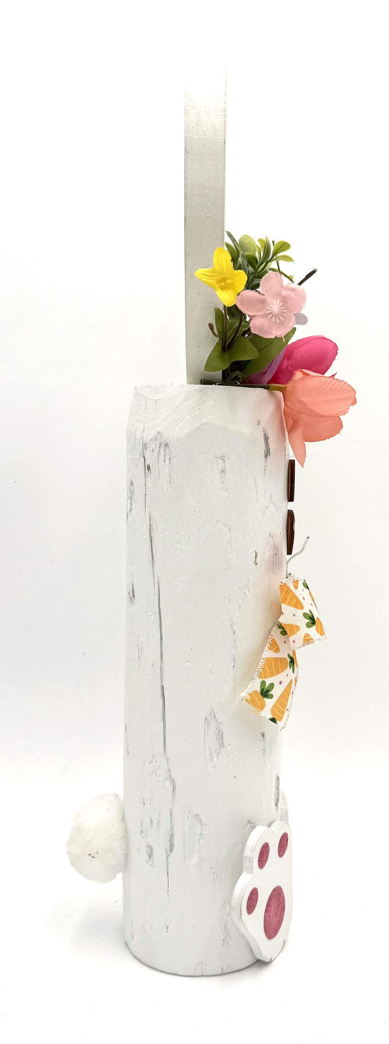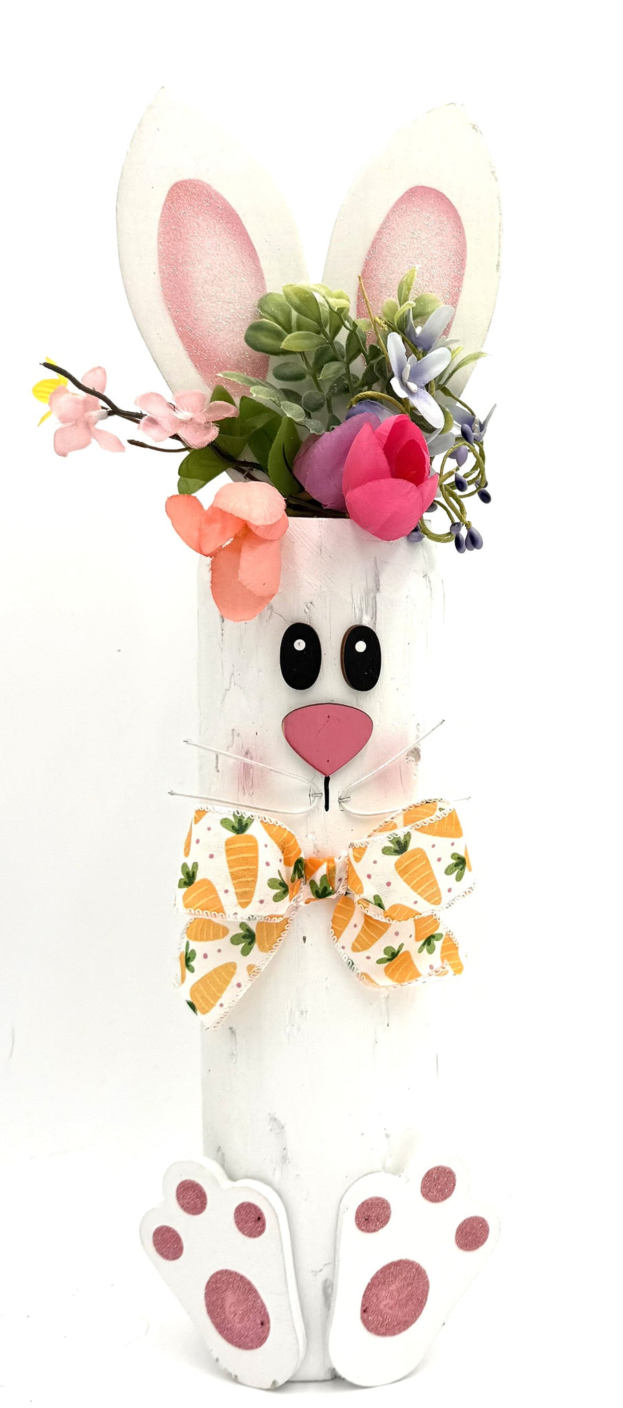 Bunny decoration is handmade from refurbished grape post & painted with a high quality paint. Bunny ears, nose, and bunny feet are separate pieces of painted wood, which are securely attached to the bunny's body. Carefully hand-painted, each bunny feature cloth coved wire whiskers, a ribbon bow, artificial flowers, bunny tail and a touch of sparkling glitter. Soft colors and delicate accents make it perfect for Easter and everyday spring decor. Proudly designed and Made in the USA!